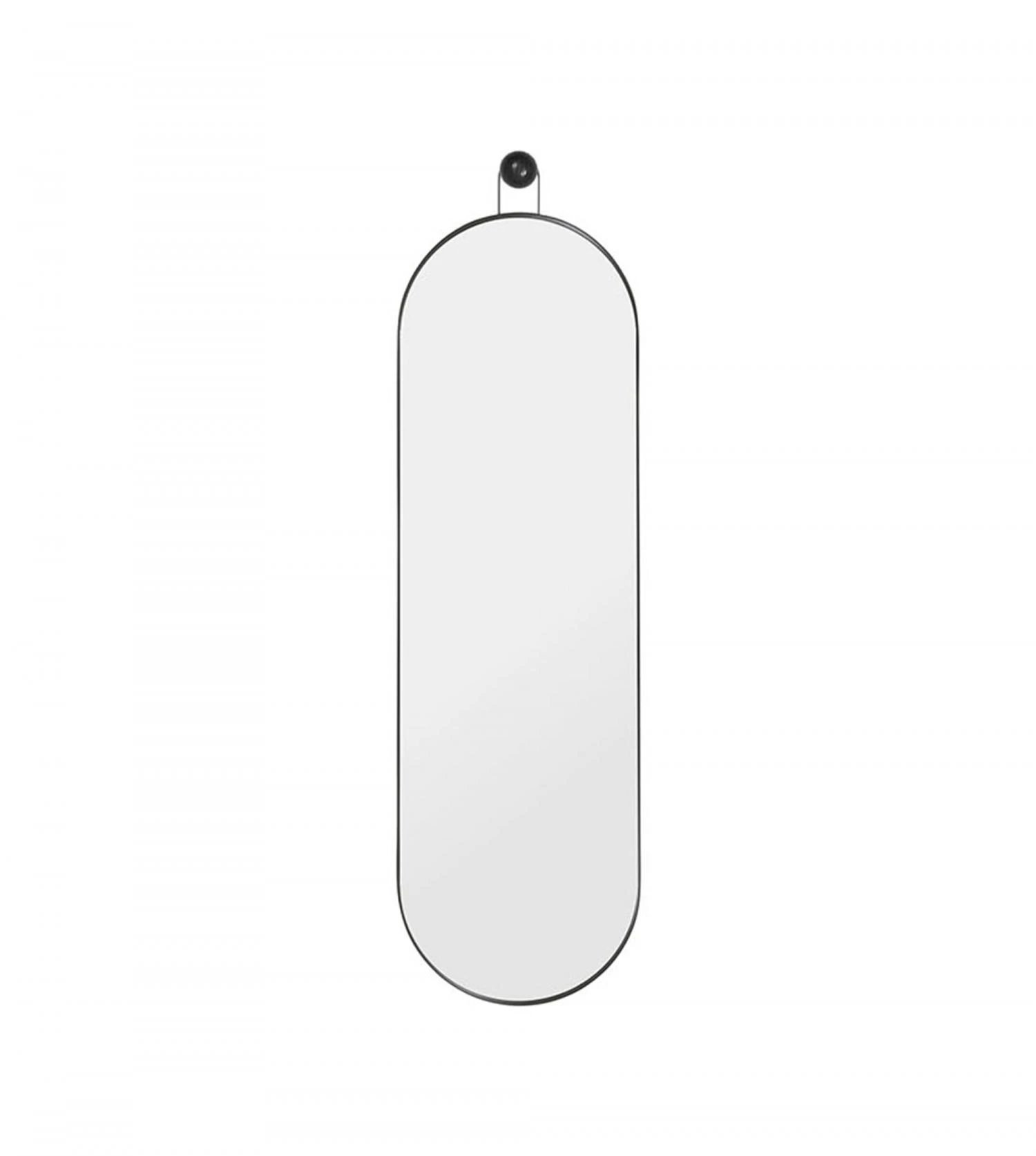 Un miroir aux lignes élégantes soutenu par une patère en bois. Le cadre oval du miroir est en métal laqué.