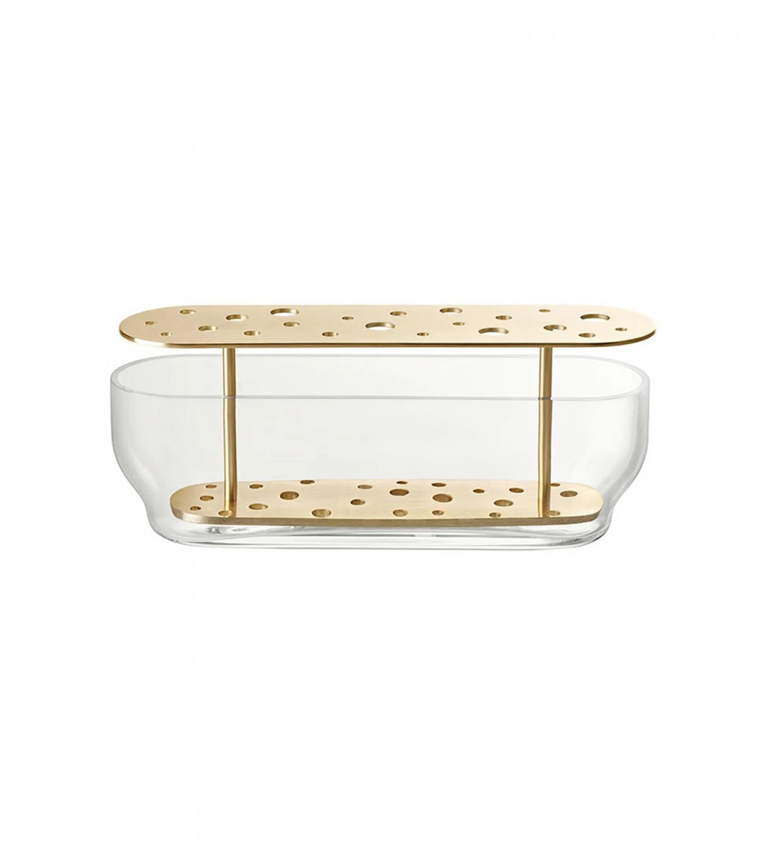 Comme dans une auberge espagnole, chacun a participé à sa manière à cette élégante création. La débordante imagination du designer a donné naissance au vase Ikebana Long, mettant à l’honneur l’art floral japonais à travers une création conçue artisanalement pour Fritz Hansen. Le verre rencontre ici une structure en laiton ponctuée d’orifices permettant le passage d’une tige ou d’un branchage. L’ensemble, graphique et épuré révèle l’agencement harmonieux de la matière. Une composition zen, une pièce design unique pour tout type de décoration, de la plus sage à la plus audacieuse. Sur une table basse dans un salon, sur le rebord d’une fenêtre dans une salle de bains et partout ailleurs dans la maison, le vase long Ikebana Fritz Hansen fait souffler un vent de fraicheur et vibre d’une délicatesse toute nippone. La maison danoise poursuit son exploration des possibilités offertes par le design en collaborant avec de jeunes créatifs comme Jaime Hayon tout en continuant l’édition des pièces iconiques imaginées il y a quelques décennies par Arne Jacobsen. Avec la gamme de vases Ikebana Fritz Hansen fait souffler un peu de poésie à travers des objets célébrant l’évanescence des choses. Délicieux haïkus.