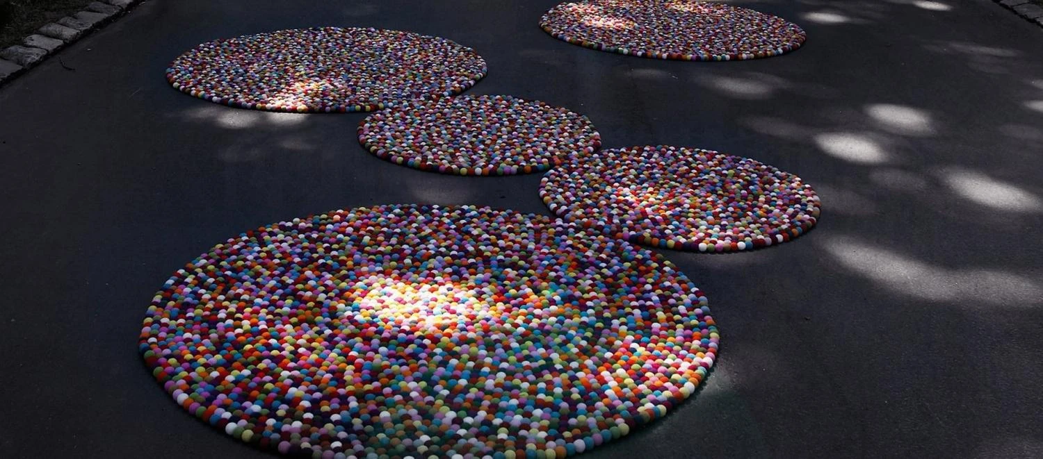 Pinocchio est un tapis qui fait sourire : rond, il est composé de billes en laines toutes colorées. Ce tapis, inspiré des petits bonbons danois, est fait au Népal où chaque bille y est feutrée et enfilée sur un fil à la main.