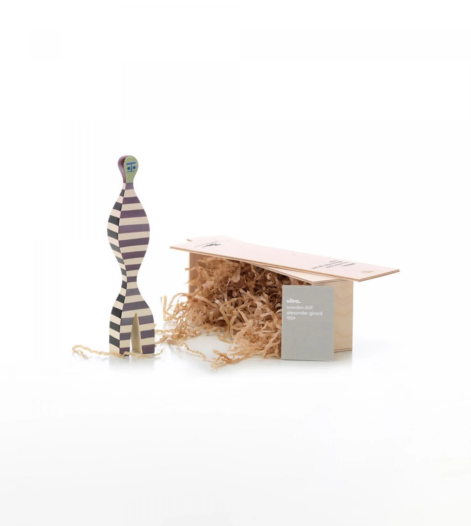 Figure énigmatique à rayures, la wooden doll n°16 éditée par Vitra fait toujours autant d’effet 70 ans après sa création. Poupée en bois massif imaginée par le designer américain Alexander Girard pour la décoration intérieure de sa propre maison de Santa Fe, elle appartient à une collection de sculptures colorées façonnées et peintes à la main qui alterne représentations animales et humaines. De la wooden doll n°1 multicolore à la poupée en bois Mother Fish and child (disponibles chez Blou) en passant par celle qui porte le n°16, Alexander Girard a joyeusement décliné son concept de sculptures design décoratives. Inspiré par les arts populaires, il s’est particulièrement illustré avec ses motifs graphiques et colorés. Fabriquée et peinte à la main, la wooden doll n°16 Vitra représente un personnage longiligne aux rayures bicolores qui trouvera naturellement sa place sur une enfilade, une étagère ou un bureau. Poupée décorative design pour petits et grands, elle s’apprécie seule ou accompagnée d’un autre modèle de la collection. Graphique, artisanale et intemporelle, elle se met en scène dans toutes les pièces de la maison et donne du relief à tout type de décoration (classique, contemporaine, design). Livrée dans un élégant coffret en bois accompagné d’une brochure, la wooden doll n°16 est une véritable signature, une pièce de collection authentique et atypique qui séduira les amateurs de design adeptes de l’univers graphique d’Alexander Girard.