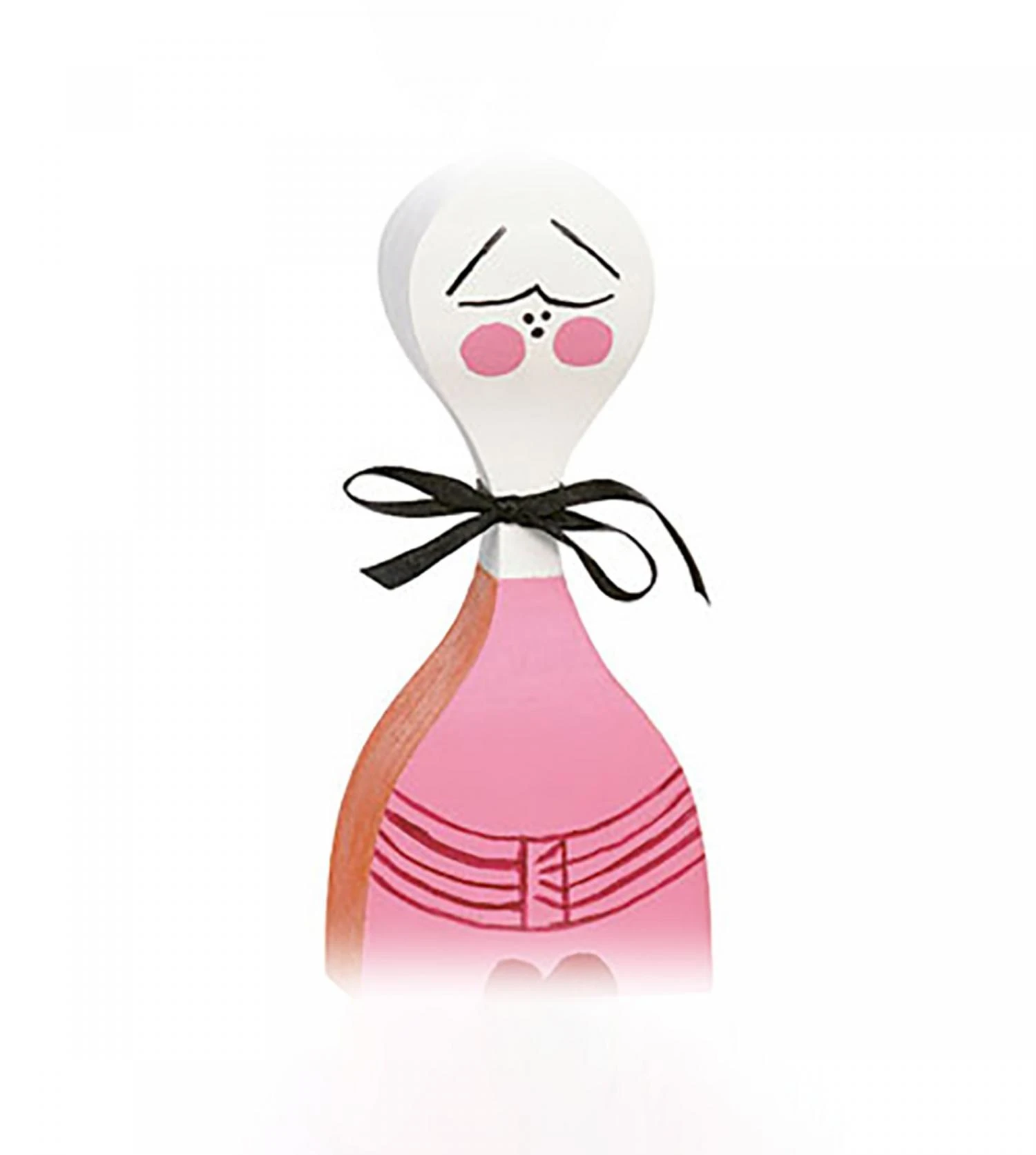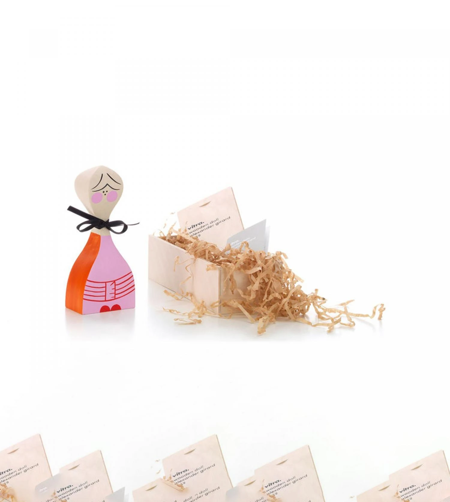 Figurine aux traits humains dotée d’un petit ruban, la poupée en bois n°2 de la collection wooden dolls signée Alexander Girard apportera une touche décorative colorée à tous les intérieurs grâce à ses motifs roses et rouges peints à la main. Imaginée à l’origine par et pour le designer américain Alexander Girard, cette poupée graphique en sapin massif a depuis rejoint le catalogue de la marque Vitra qui donne ainsi la possibilité aux amateurs de décoration intérieure de posséder un exemplaire unique d’une de ces figurines. Sculptée et peinte à la main, la wooden doll n°2 à l’expression énigmatique baladera sa silhouette douce dans toutes les pièces de la maison, de l’entrée à la chambre à coucher en passant par le bureau, la salle à manger et le salon. Seule ou accompagnée d’une autre poupée de la gamme comme la féline wooden doll Cat (en vente chez Blou) elle se met en scène sur une étagère, une enfilade, une étagère ou une table basse. Sculpture en bois, élément décoratif design ou jouet pour petits ou grands : chacun attribuera le rôle qu’il veut à cette figurine agrémentée d’un ruban noué autour du cou. Inspirants et inspirés, les motifs graphiques imaginés par Alexander Girard pour ses poupées en bois comme pour ses nombreuses créations textiles sont nés de sa passion pour les arts populaires sud-américains et asiatiques. La wooden doll n°2 Vitra plaira aux amateurs de design et de décoration intérieure à la recherche d’une création atypique et ludique aux accents naïfs capable de donner facilement du style à un lieu. Imaginée en 1952, cette poupée intemporelle et colorée possède une élégance graphique toujours d’actualité. Un bon début pour commencer une nouvelle collection.